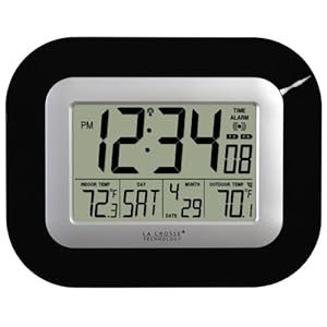 This atomic digital wall clock from La Crosse Technology not only conveys the precise time and date, but also informs users of current indoor and outdoor temperatures. Radio-controlled by transmissions from the national atomic clock in Fort Collins, CO, the clock regularly resets time for increased accuracy and adapts automatically for daylight savings time. A remote TX38U sensor transmits climate data at 915 MHz from up to 200 feet from the clock.Sleek in black casing, the wall clock benefits from a built-in stand for optional table placement. The LCD clock expresses the time in either a 12-hour or 24-hour format. Along the bottom of the screen, the clock conveys the date, day of week, indoor temperatures ranging from 14.2 to 99.9 degrees F, and outdoor temperatures ranging from -39.8 to 139.8 degrees F. English, French, German, and Spanish languages are available for day display, and temperatures can be viewed in either Celsius or Fahrenheit degrees. Using the functions on the back, the user selects the appropriate time zone from +/-12 GMT for atomic time coordination. This interface also permits the user to deactivate the auto DST feature and to set the alarm and its 10-minute snooze. To power the clock and the sensor, the separate purchase of two AA batteries and two AAA batteries is required; replacement is indicated with low battery icons. A limited one-year warranty covers this item. The clock measures 9 inches wide by 4/5 inch deep by 7-1/5 inches high, while the sensor measures 1-1/3 inches wide by 1/2 inch deep by 3-2/5 inches high.